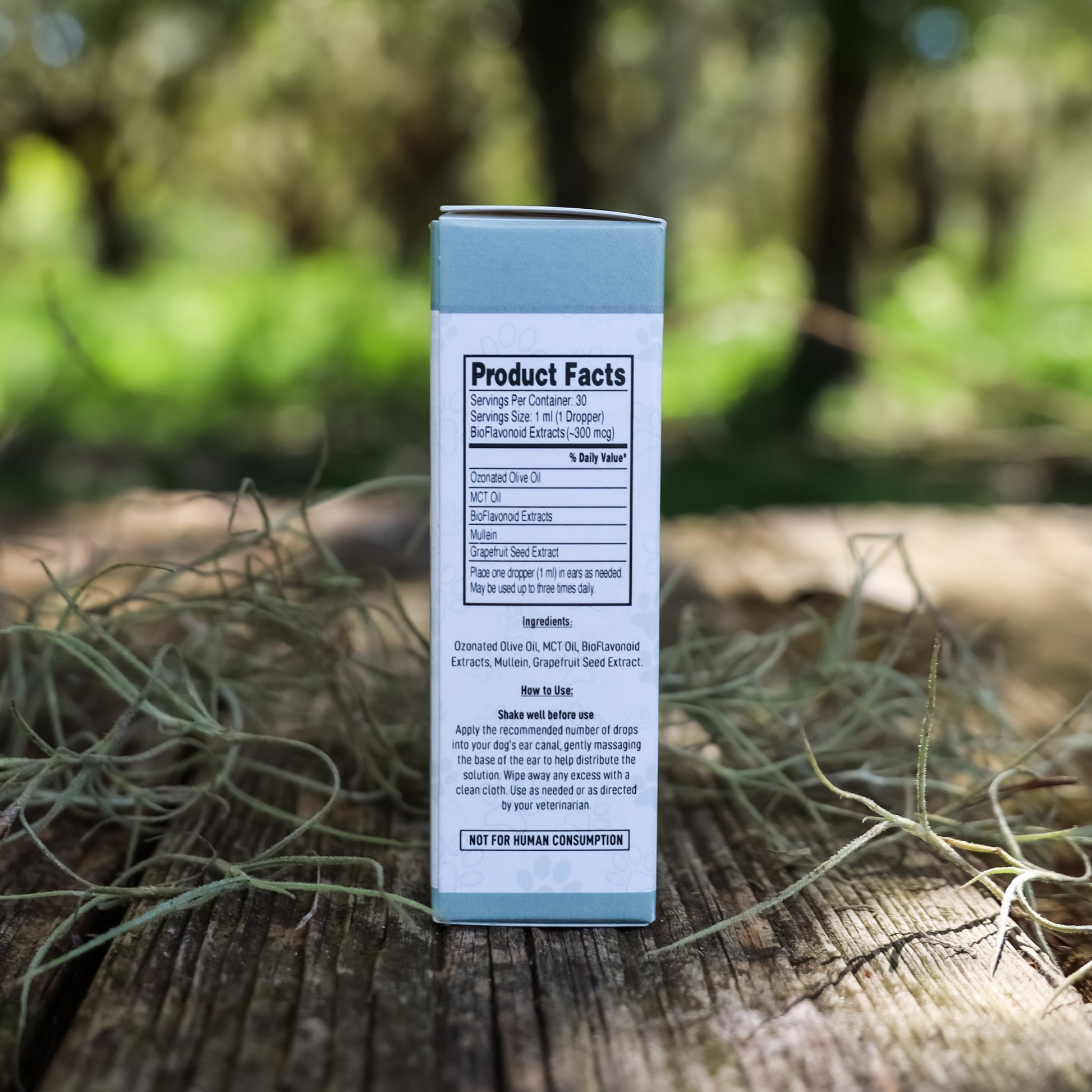 Ozonated Olive Oil - This unique ingredient is rich in natural antioxidants and has antimicrobial properties, making it ideal for cleansing and protecting your dog’s ears from unwanted bacteria and fungi.